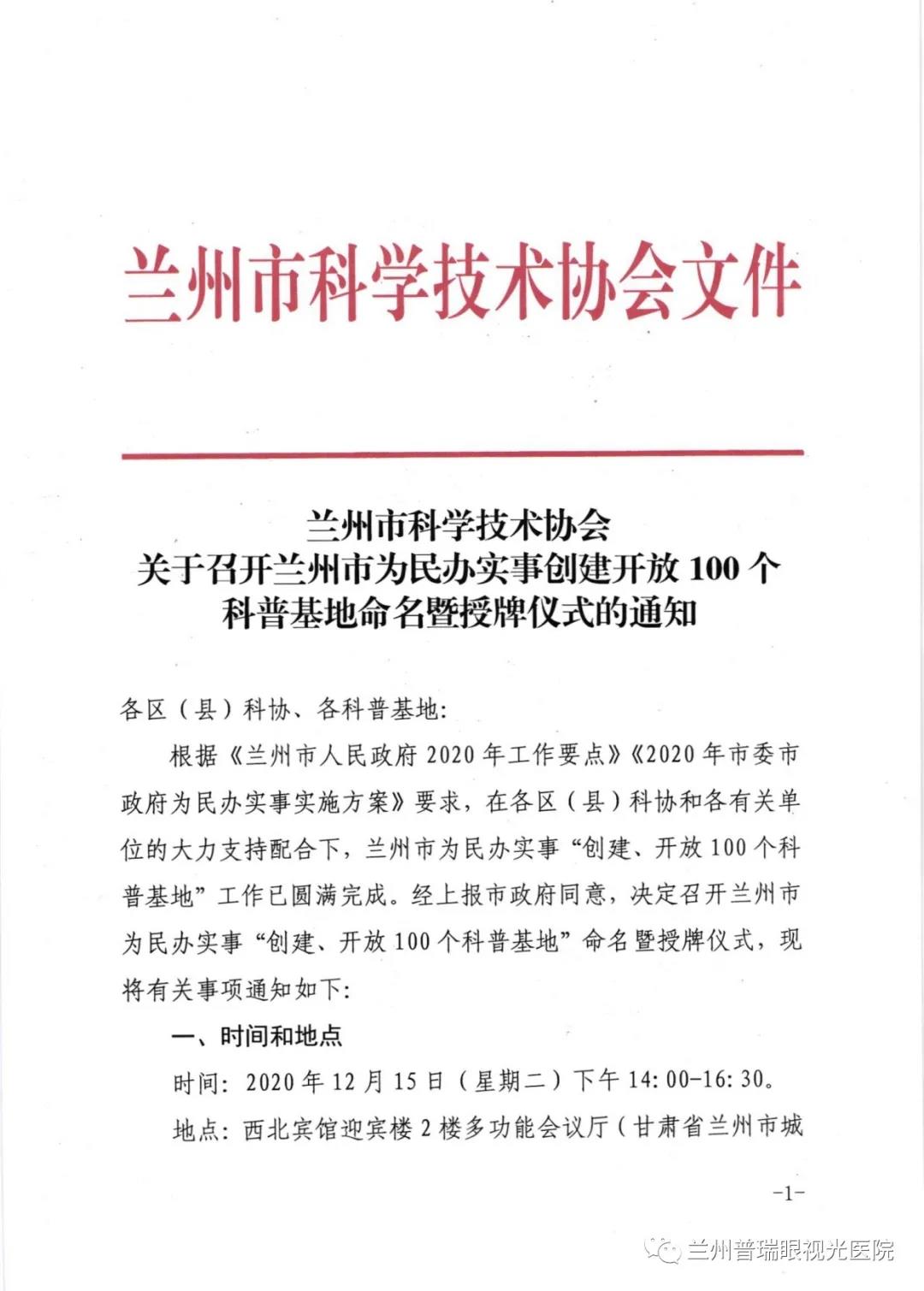 12月15日,蘭州市科協(xié)在西北賓館召開“蘭州市委市政府為民辦實事創(chuàng)建開放100個科普基地命名授牌儀式”,蘭州市各區(qū)(縣)科協(xié)、100個科普基地的負責人、在蘭高校(科協(xié))科技處、蘭州新區(qū)組織部、蘭州消防救援支隊及受表彰先進個人等200余人參加。蘭州普瑞眼視光醫(yī)院入選為“蘭州科普基地”。